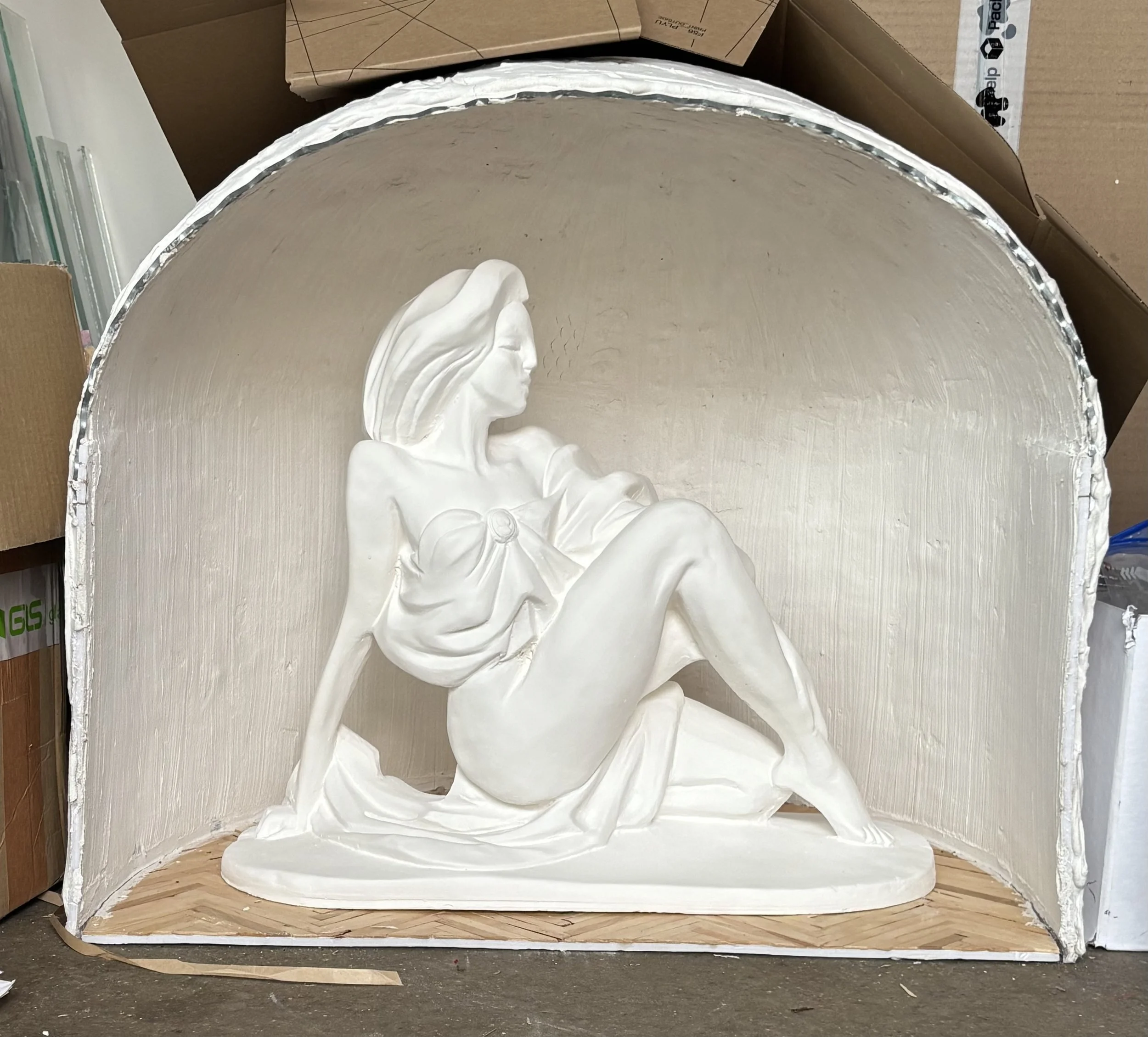 The second week centred on the development of her new sculpture, “Shrine to the Housing Gods”, a piece that combines salvaged building materials with glass elements in a grotto-like form. Drawing on both folklore and social commentary, the work reflects Alison’s ongoing investigation into the idea of shelter and the realities of the housing crisis.