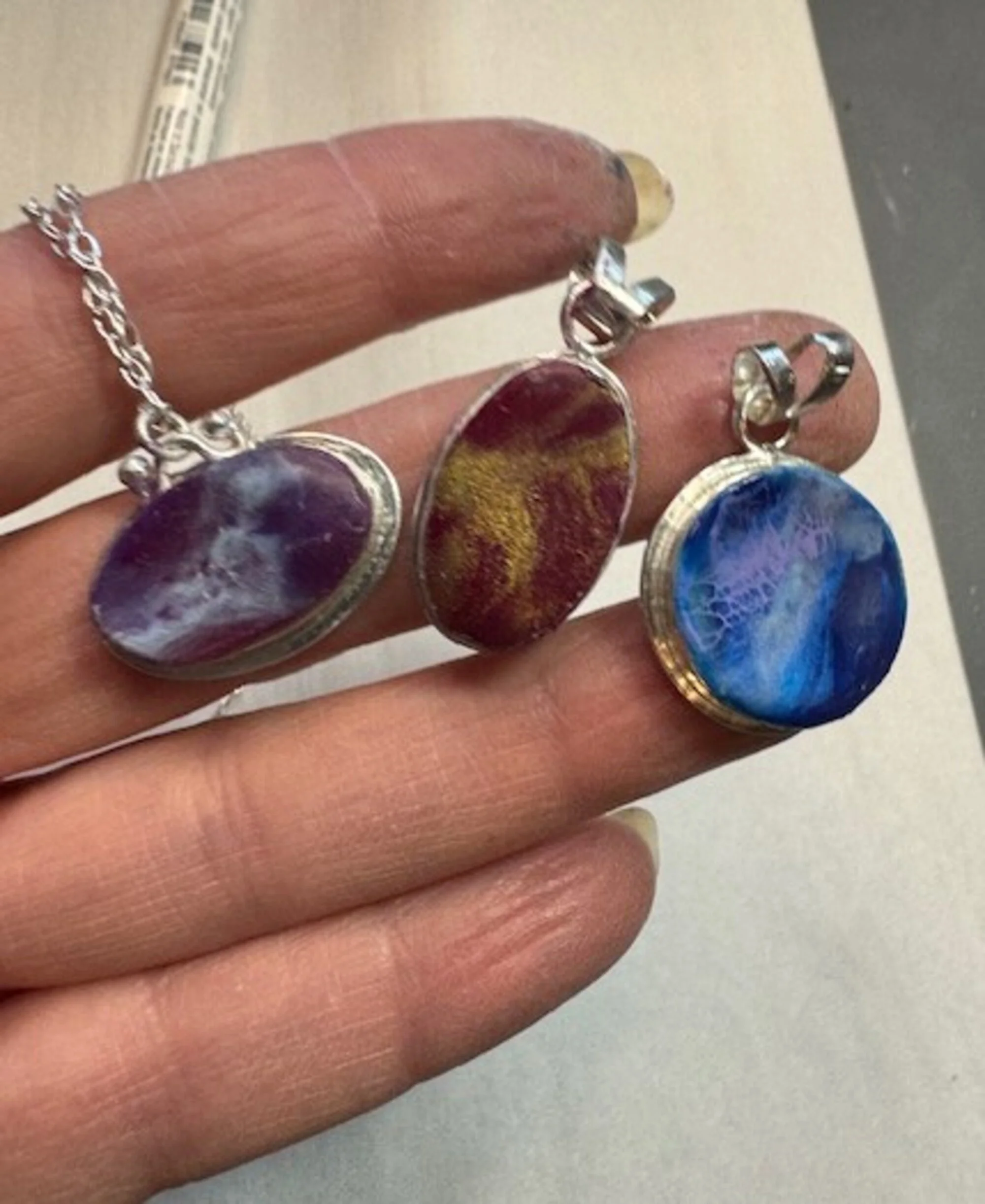 This class is ideal for beginners to experienced encaustic artists. You’ll come away with 6 eye-catching necklaces that reflect your style! The fee covers all of the materials you’ll need, including chains, 5 stainless steel bezels and 1 decorative brass bezel in either a round or teardrop shape. You can purchase more decorative brass bezels separately. Participants are encouraged, but not required, to bring their favorite encaustic paints, small ceramic tools and small brushes.